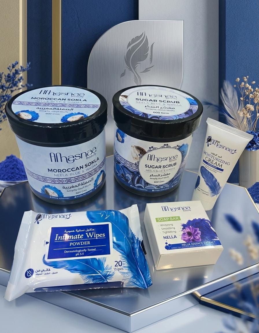 كمية بكج مكس النيلة والودعة 5 قطع(مقشر و صقلة نيلة ودعة+وايبس+صابون بار نيلة+كريم)